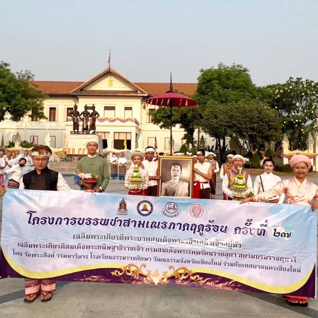 ” โครงการบรรพชาสามเณรภาคฤดูร้อนเฉลิมพระเกียรติฯ ปีที่ ๒๗ ประจำปีพุทธศักราช ๒๕๖๘ วัดพระสิงห์ วรมหาวิหาร โรงเรียนธรรมราชศึกษา ร่วมกับเทศบาลนครเชียงใหม่ เฉลิมพระเกียรติพระบาทสมเด็จพระเจ้าอยู่หัว รัชกาลที่ ๑๐ เฉลิมพระเกียรติสมเด็จพระกนิษฐาธิราชเจ้า กรมสมเด็จพระเทพรัตนราชสุดาฯ สยามบรมราชกุมารี ในวโรกาสเจริญพระชนมายุ ๗๐ พรรษา น้อมถวายแด่พระคุณพระอุบาลีคุณูปมาจารย๋ ( ฟู อตตสิวมหาเถร ) องค์ผู้ก่อตั้งโรงเรียนธรรมราชศึกษา ในโอกาสครบ ๑๒๔ ปีชาตกาล ระหว่างวันที่ ๒ – ๑๒ เมษายน ๒๕๖๘ ณ วัดพระสิงห์ วรมหาวิหาร จังหวัดเชียงใหม่”