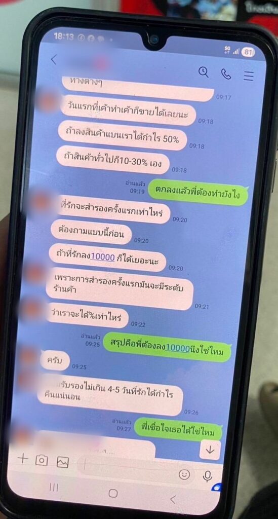 เคสที่ 2 ศูนย์ ACSC ประสานตำรวจ สภ.สามพราน เข้าช่วยเหลือผู้เสียหายเป็นหญิง วัย 50 ปี ทันทีหลังพบว่ามีการโอนเงินไปยังบัญชีบริษัทแห่งหนึ่งซึ่งเป็นบัญชีม้า (รับโอนเงินจากการหลอกลวงโดยไม่ได้มีการทำธุรกิจจริง) ก่อนจะทราบว่าเมื่อวันที่ 14 พ.ย.2568 ได้มีคนร้ายใช้ไลน์ ชื่อ “บอม เบ 100” ทักหาผู้เสียหาย พูดคุยลักษณะหลอกให้รัก โดยไม่มีการเปิดกล้องหรือพบตัวกัน กระทั่งโน้มน้าวจนผู้เสียหายเชื่อใจ คนร้ายได้ชักชวนให้ลงทุนทำธุรกิจในลักษณะขายของออนไลน์ โดยอ้างว่าจะได้ผลตอบ แทน 20% จากเงินที่ลงทุนไป ซึ่งผู้เสียหายได้โอนเงินลงทุนไป จำนวน 3 ครั้ง ยอดรวม 140,000 บาท