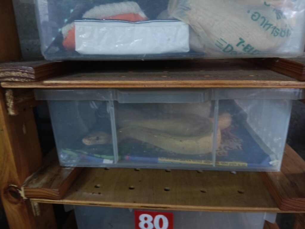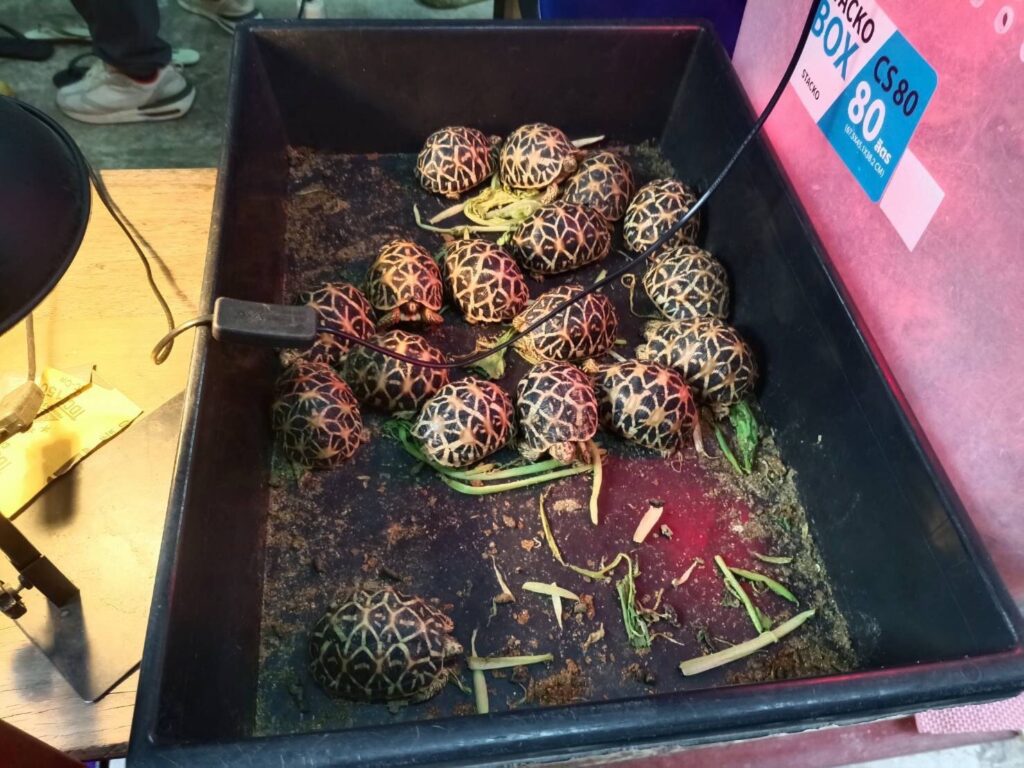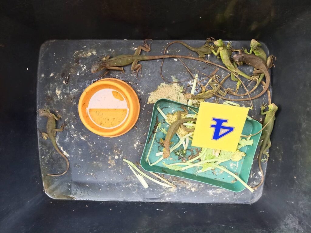 จำนวน 12 ตัว, อิกัวน่าหางหนามดำ อิกัวน่าดำ (Ctenosaura similis) จำนวน 8 ตัว, งูหลามบอล (Python regius) จำนวน 6 ตัว ซึ่งเป็นสัตว์ป่าควบคุม ที่ไม่ต้องแจ้งการครอบครองตามบัญชีไซเตส 2 และพบ เต่าดาวอินเดีย (Geochelone elegans) จำนวน 19 ตัว เป็นสัตว์ป่าควบคุมที่ต้องแจ้งการครอบครอง