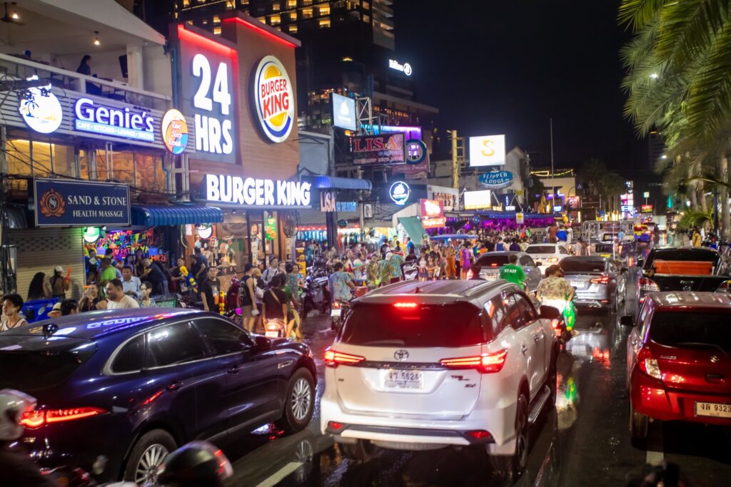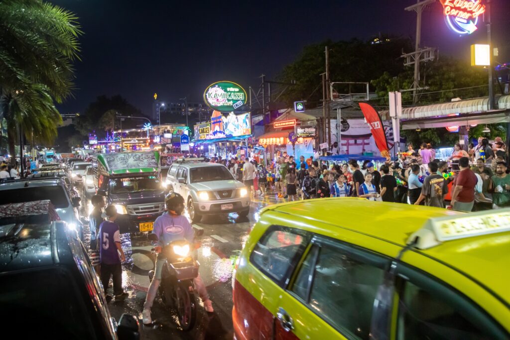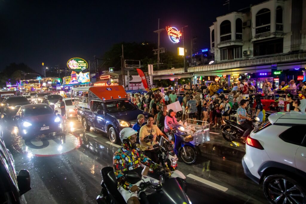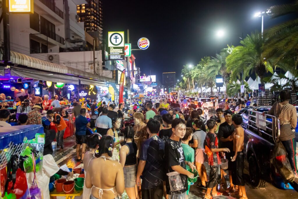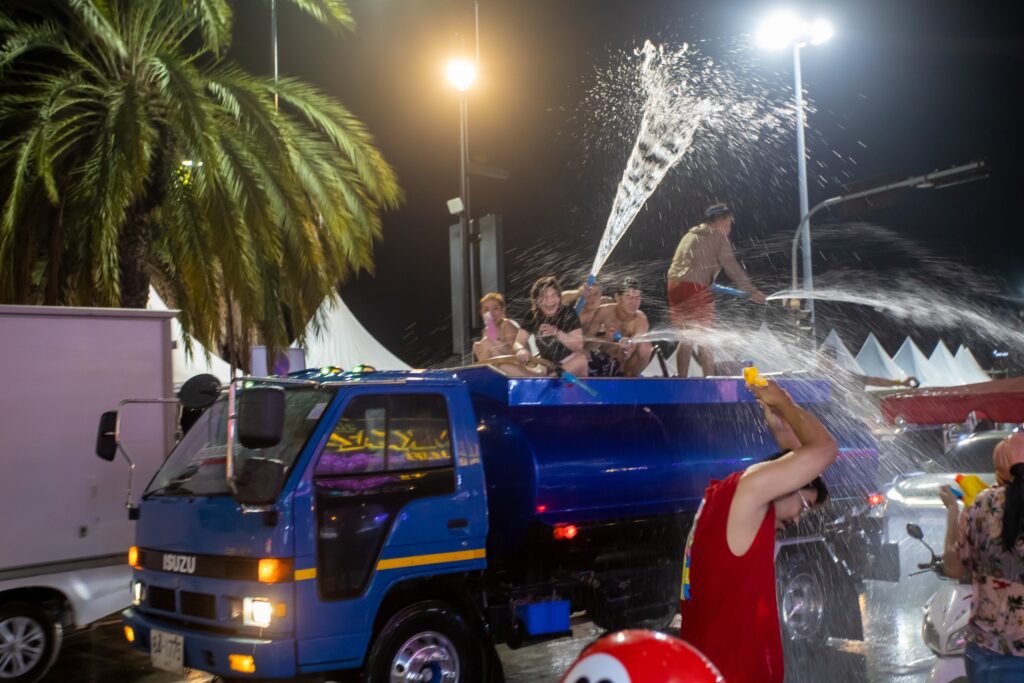 ที่ถนนเลียบชายหาดพัทยา อ.บางละมุง จ.ชลบุรี นักท่องเที่ยวทั้งชาวไทยและชาวต่างชาติ ได้เดินออกมาเล่นน้ำ ตามบาร์เบียร์ต่างๆ เป็นจำนวนมาก ซึ่งนักท่องเที่ยวบางคนก็ขับรถน้ำคันใหญ่ออกมาฉีดนักท่องเที่ยว บางกลุ่มก็ขับขี่รถจักรยานยนต์ และนำถังน้ำขึ้นหลังรถกระบะ มาร่วมกันเล่นสงกรานต์ตามถนนชายหาดพัทยา ทำให้การจราจรบริเวณดังกล่าวเคลื่อนตัวได้อย่างช้าๆ
