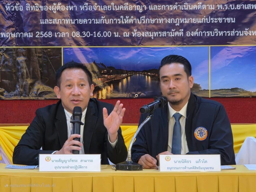 การจัดโครงการในหัวข้อ “สิทธิของผู้ต้องหาหรือจำเลยในคดีอาญา และการดำเนินคดีตาม พ.ร.บ.ยาเสพติดฯ” ในครั้งนี้ มีความสำคัญอย่างยิ่ง เพราะเป็นเรื่องที่เกี่ยวข้องกับความเป็นธรรมในกระบวนการยุติธรรม และผลกระทบต่อชีวิตและเสรีภาพของประชาชนโดยตรง การที่ประชาชนมีความรู้ความเข้าใจในสิทธิของตนเองเมื่อตกอยู่ในสถานะผู้ต้องหาหรือจำเลย จะเป็นเกราะป้องกันตนเองจากการถูกละเมิดสิทธิ และสามารถเข้าสู่กระบวนการยุติธรรมได้อย่างถูกต้องและเป็นธรรม เวลา 09.00-11.00 น. นายสัญญาภัชระ สามารถ อุปนายกฝ่ายปฏิบัติการ นายนิติธร แก้วโต อนุกรรมการด้านคดีสิทธิมนุษยชน อบรมให้ความรู้เรื่อง “สิทธิของผู้ต้องหาหรือจำเลยในคดีอาญาและความคุ้มครองตามพระราชบัญญัติป้องกันและปราบปรามการทรมานและการกระทำให้บุคคลสูญหาย พ.ศ. 2565 เวลา 11.00-12.30 น. อบรมให้ความรู้เรื่อง “เมื่อตกเป็นผู้ต้องหาในคดียาเสพติด” โดย พันตำรวจเอก ดร. สมศักดิ์ หน่องพงษ์ อดีตผู้กำกับการ 3 กองบังคับการตำรวจปราบปรามยาเสพติด 1 เวลา 13.30 -15.00 น. บริการให้คำปรึกษากฎหมายแก่ประชาชนและการจัดทนายความอาสาว่าต่างแก่ต่างในคดี และเวลา 15.00-16.00 น. สรุปการอบรบ